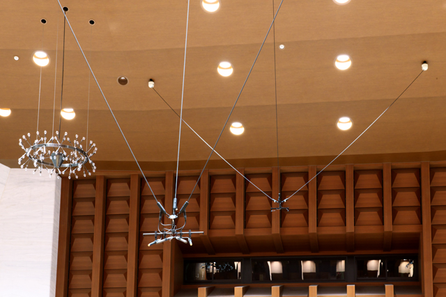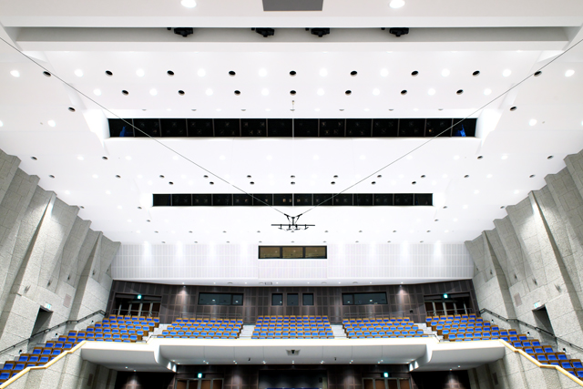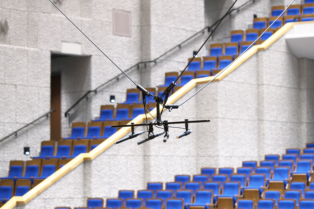 コンサートホールでは不可欠な3点吊マイク装置は、スムーズでスピーディーな動作・操作性を兼ね備え、3つの安全装置(突上げ防止・過負荷防止・仮想防止装置)を装備する3点吊マイク装置を導入しました。更に小ホールでは、3点吊マイク装置を2基設置し、多チャンネル録音も可能にした多点吊マイクシステムを実現しております。